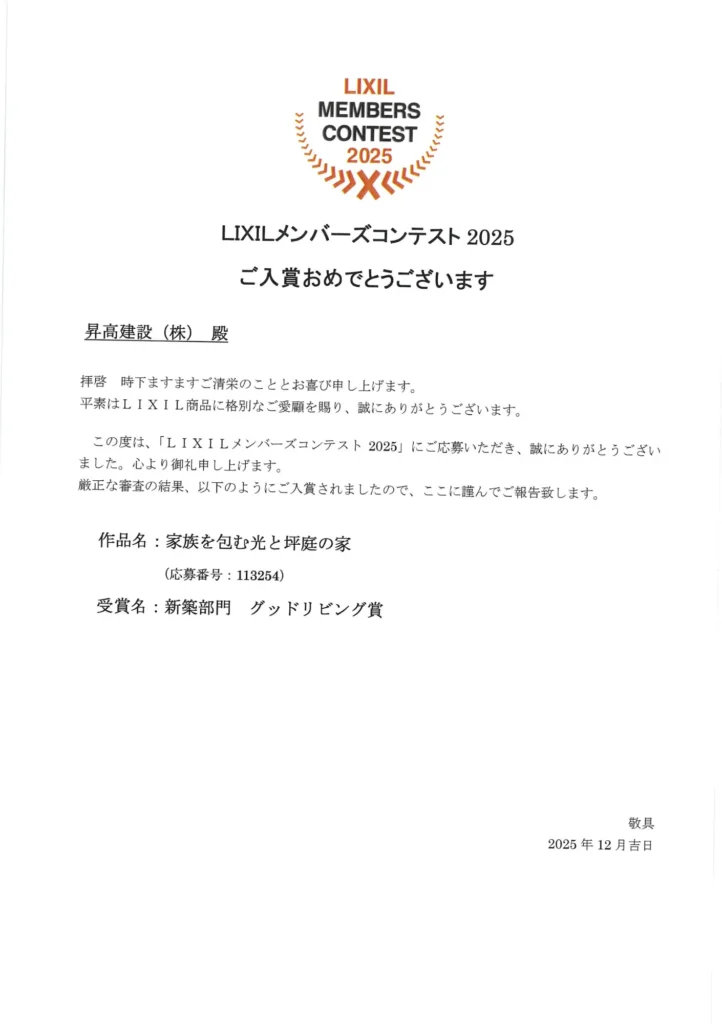 Category すべて プレスリリース 企画情報 イベントレポート 日本最大級の住宅コンテスト「LIXILメンバーズコンテスト2025」において、 弊社が手がけた住宅が新築部門【グッドリビング賞】を受賞いたしました! 今回受賞した住宅では、施主様の家づくりに対する想いを丁寧に汲み取り、 「機能性」と「デザイン性」を兼ね備えた住まいを追求しました。 特に、畳をラグのように取り入れた現代的な和モダンリビングと、 そこから望む美しい坪庭は、弊社の得意とするスタイルのひとつです。 こだわりの間取りや景観、そして細部にまで配慮した設計が、 このような栄えある賞につながったと自負しております。 そして、このたびの受賞は施主様をはじめ、 日ごろより支えてくださっているみなさまのおかげです。 心より感謝申し上げます。 418BASEはこれからも、お客様一人ひとりの理想の暮らしに寄り添い、 心地よい住まいづくりをお手伝いしてまいります。 ▼受賞住宅はこちら 家族を包む光と坪庭の家 お知らせ プレスリリース